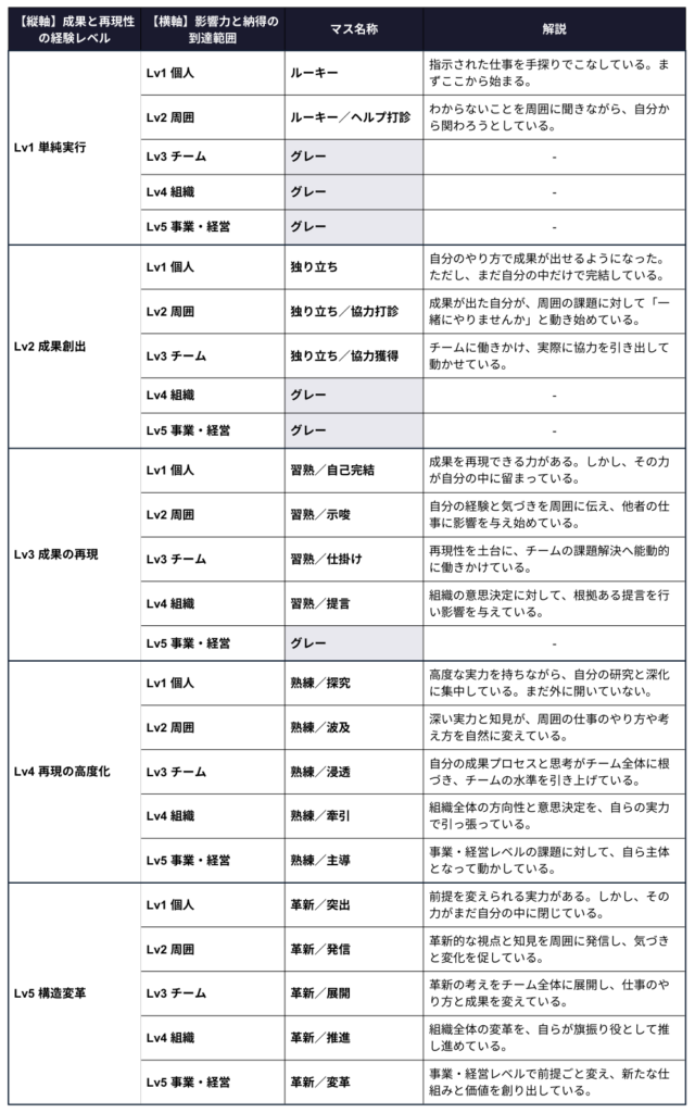 単に指示をこなす段階(Lv1)から、自力で成果を出し(Lv2)、その「出し方」を自分の方程式として確立する(Lv3)までの深化を測ります。