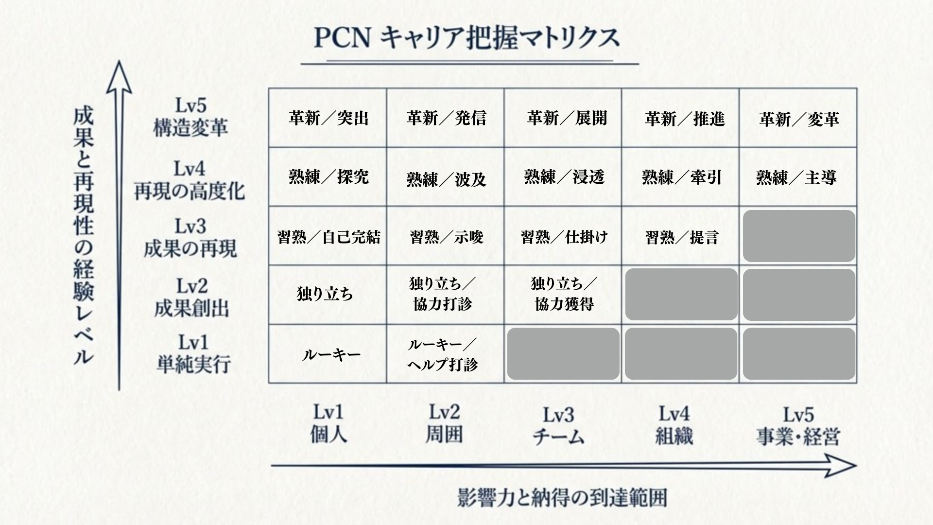 PCNでは、あなたのキャリアを「縦軸」と「横軸」のマトリクスで整理します。